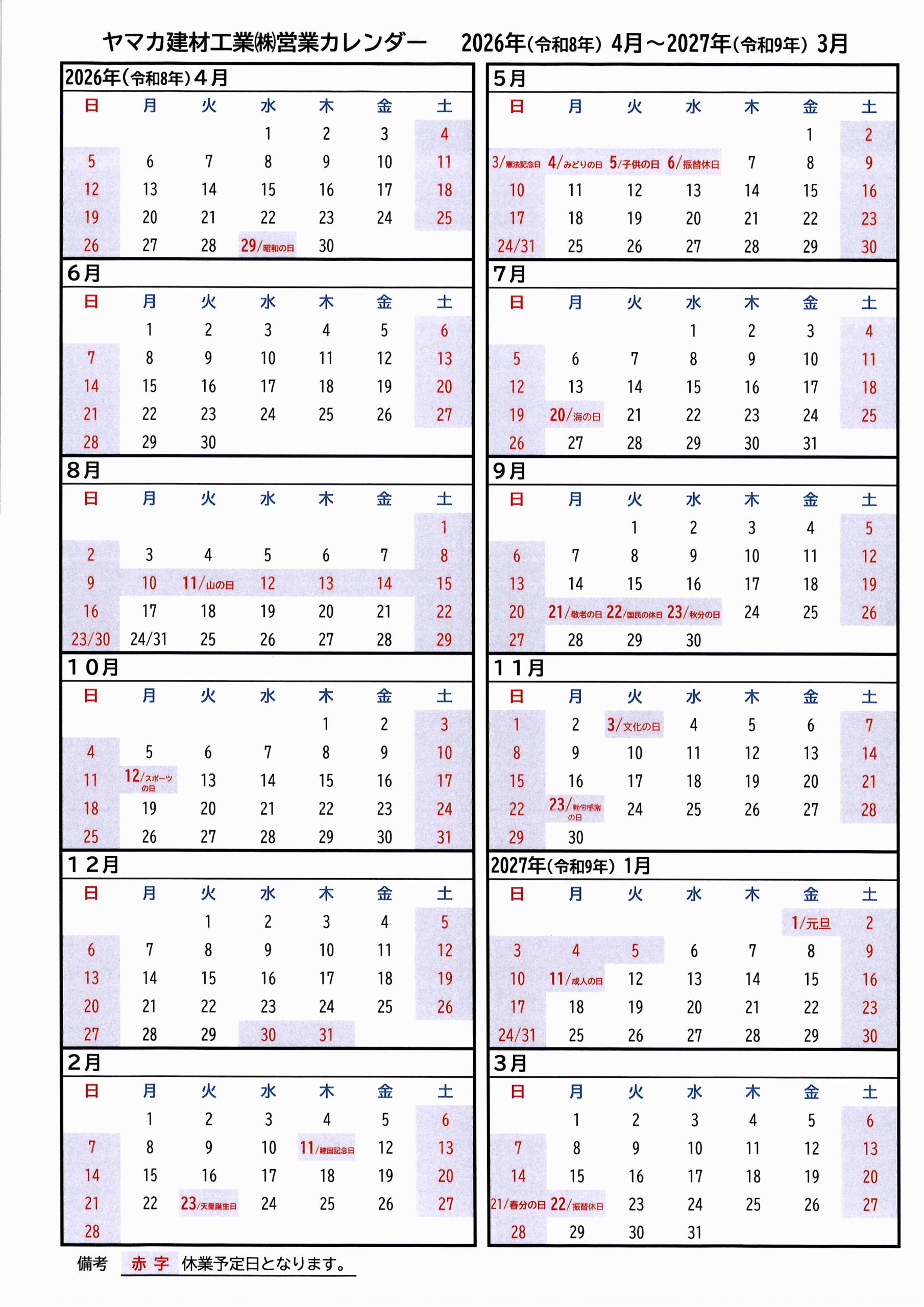 2024年度 営業カレンダー